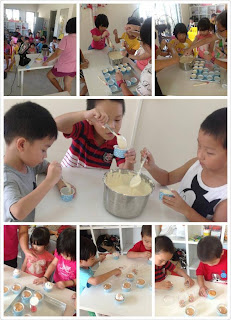 第一天, 小瓜回到家, 就很开心的跑到冰箱里, 拿出他的小杯蛋糕. 他一直告诉我, 那是他做的. 他还喋喋不休的告诉我做面粉糕的步奏. 还好是他的5岁小朋友也在那. 虽然他不能详细的讲诉在手工营里的活动. 但, 从FB里, 已经看见成长班的老师把照片上载了.